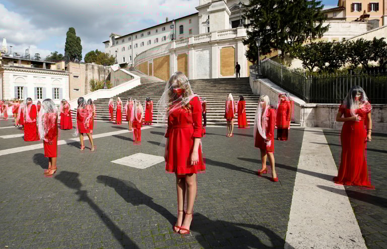 在羅馬著名地標西班牙階梯前,一群女子身穿紅色拍攝影片,希望藉此提高觀眾對性別暴力的認識,並且為 11月25日的「國際消除對女性使用暴力日」(International Day for the Elimination of Violence Against Women)做好準備。