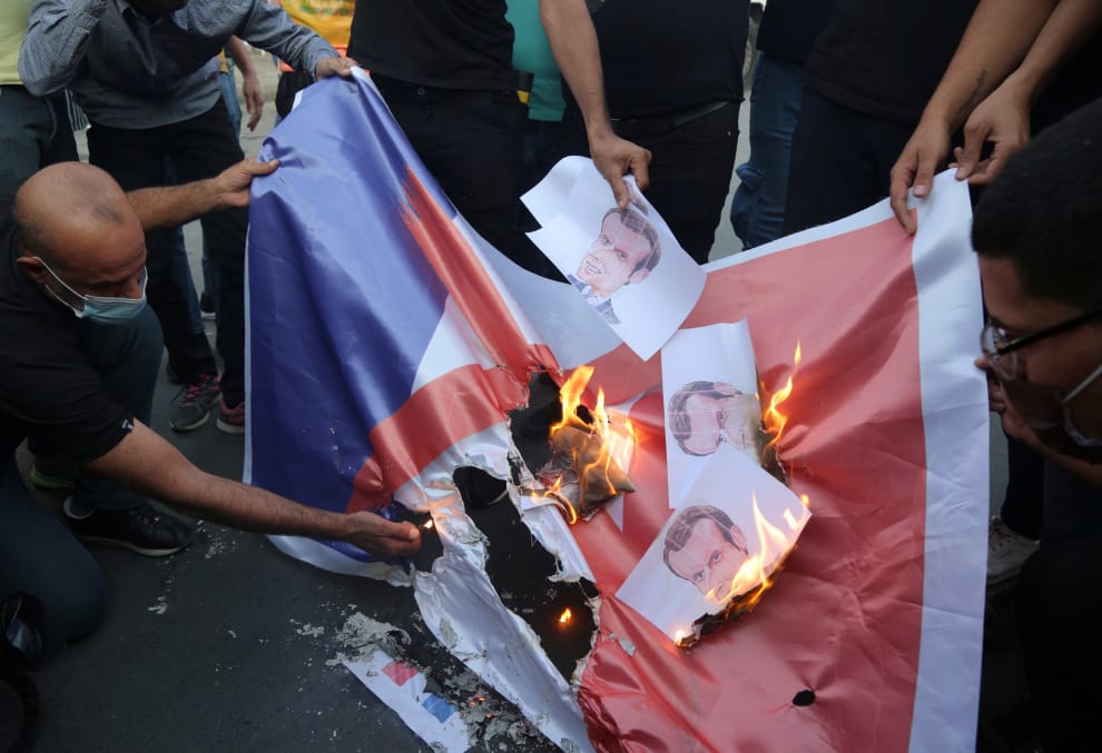 在駐巴格達的法國大使館外,民眾火燒法國國旗和法國總統馬克宏(Emmanuel Macron)的照片,藉此對法國屢屢拿伊斯蘭先知穆罕默德開玩笑表達不滿。