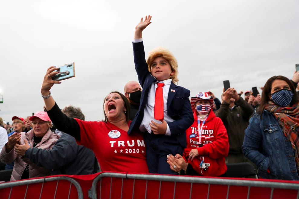 在賓州的馬丁斯堡市(Martinsburg),一名孩童打扮成美國總統川普(Donald Trump)的模樣,向前來造勢的川普揮手致意。