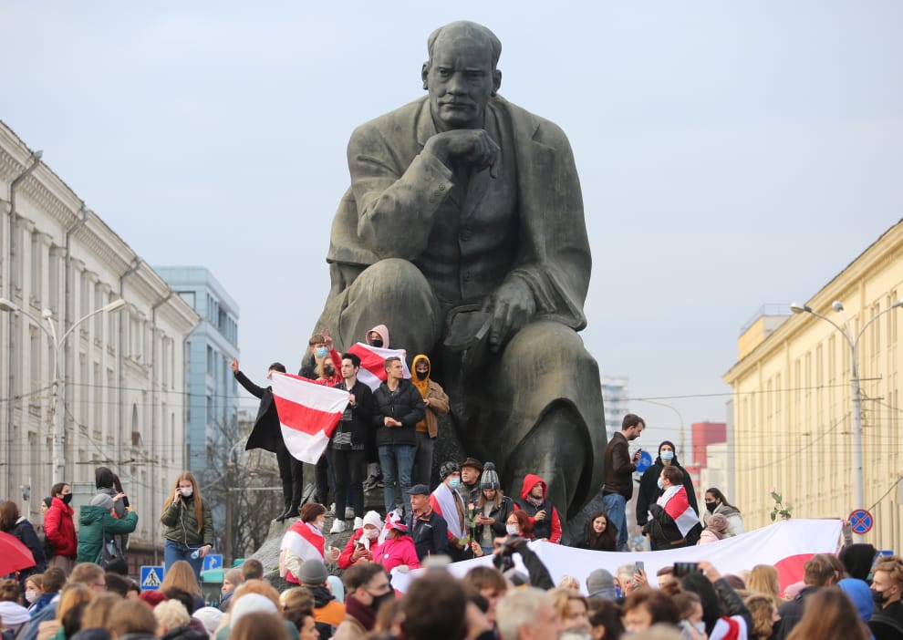 在首都明斯克,人們聚集在白羅斯著名作家科拉斯(Yakub Kolas,1882-1956)的巨型雕像下抗議,要求在總統大選中作票的白羅斯總統盧卡申科(Alexander Lukashenko)下台。