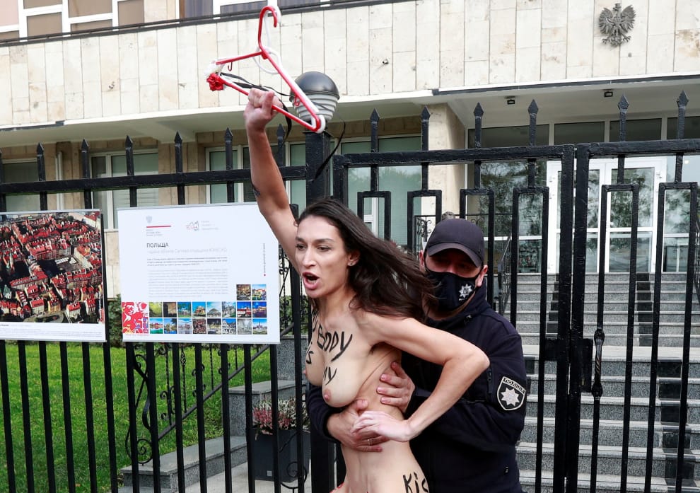 在位於首都基輔的波蘭大使館前,一名女權人士高舉衣架反對波蘭大法官新公布的釋憲結果。