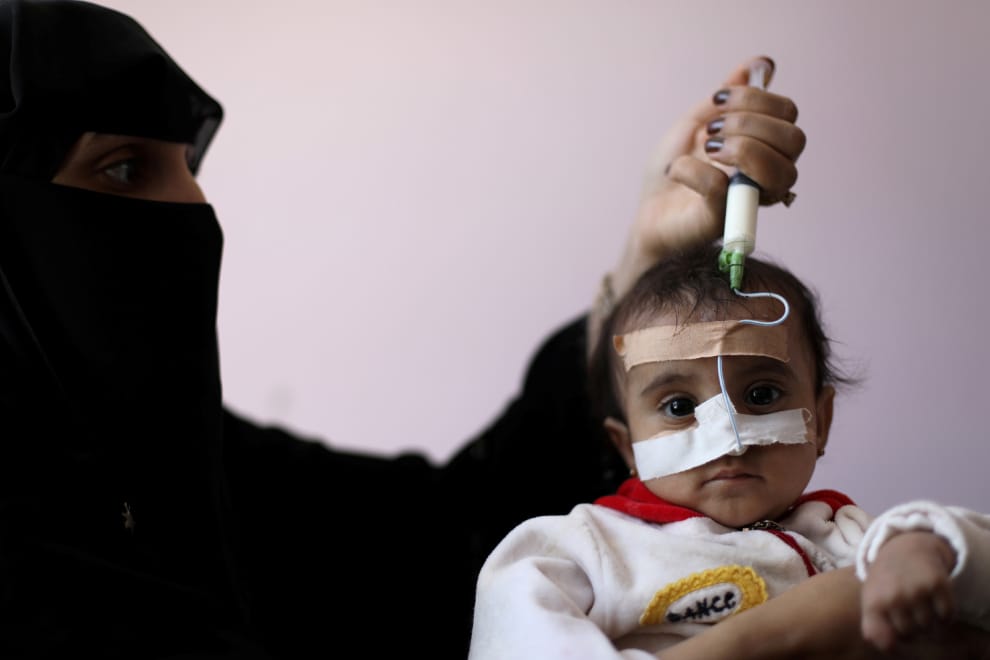 在首都沙那的沙賓醫院(al-Sabeen hospital),一名女子正在用針筒餵食她營養不良的女兒。