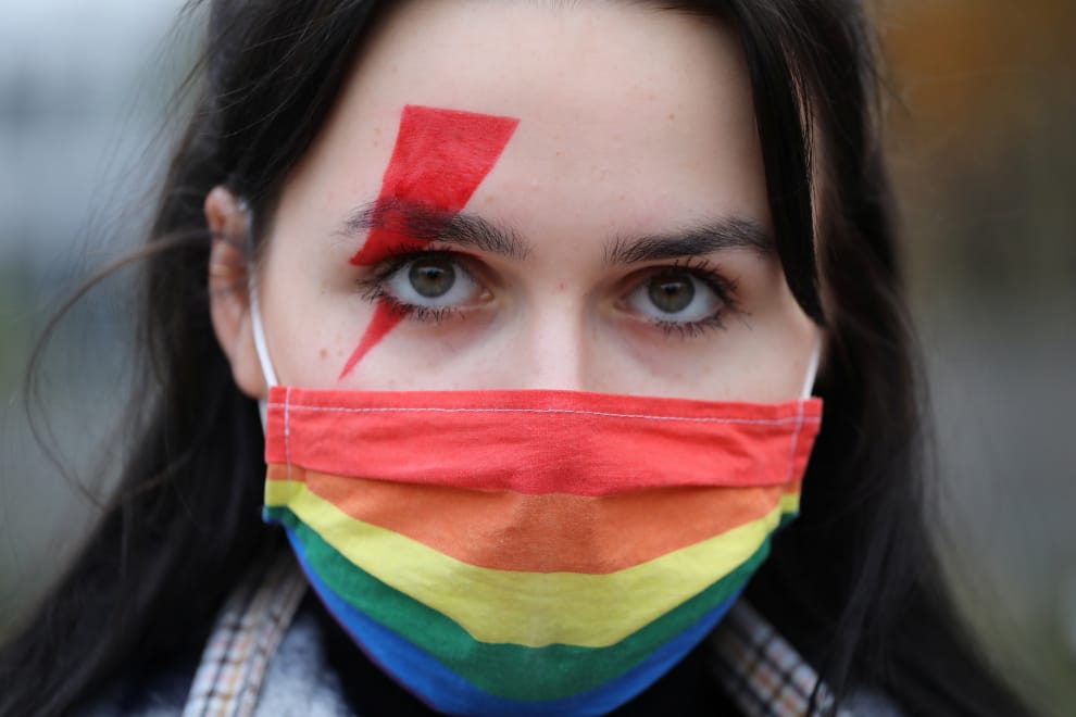 在位於華沙的國會建築前,一名女子戴上了彩虹色的口罩參加示威活動,一塊反對波蘭大法官新公布的釋憲結果──禁止婦女以「胎兒先天障礙」為由墮胎,這個結果進一步拉高波蘭女性在國內合法墮胎的難度。