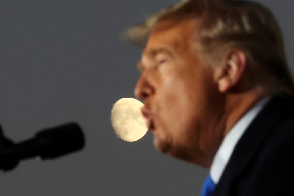 在威斯康辛州的西薩利姆村(West Salem),美國總統川普(Donald Trump)正在舉行總統大選的造勢活動,攝影師透過借位拍攝的方式,讓他看起來就好像在親吻月亮一樣。