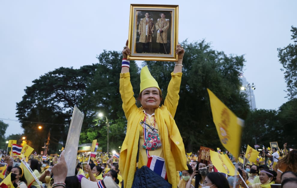 在首都曼谷,一名王室支持者穿上象徵王室的黃色T恤、手拿已故泰王蒲美蓬(Bhumibol Adulyadej)和現任泰王瓦吉拉隆功(Maha Vajiralongkorn)的照片,和近日頻頻上街要求王室改革、泰國總理帕若育(Prayut Chan-o-cha)下台的反政府示威者分庭抗禮。