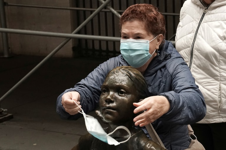 在紐約證券交易所的外頭,一名民眾替「無畏女孩」(Fearless Girl)雕像戴起了防疫口罩。
