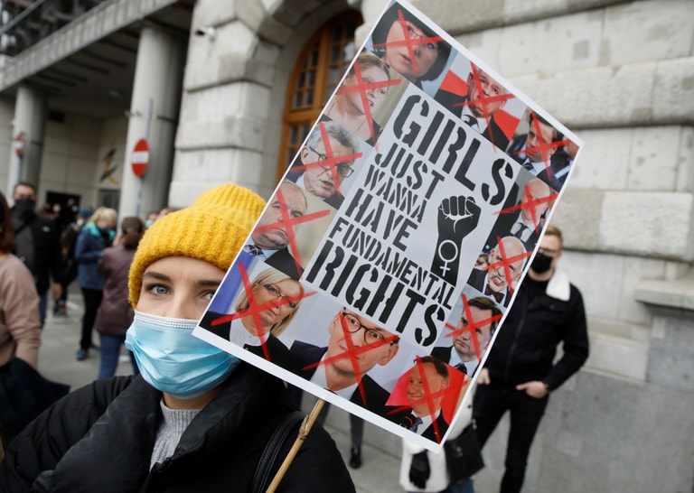 在首都華沙街頭,一名參加示威活動的女子高舉寫有「女孩們只想要基本人權」字樣的告示牌抗議,反對波蘭大法官新公布的釋憲結果──禁止婦女以「胎兒先天障礙」為由墮胎,這個結果進一步拉高波蘭女性在國內合法墮胎的難度。