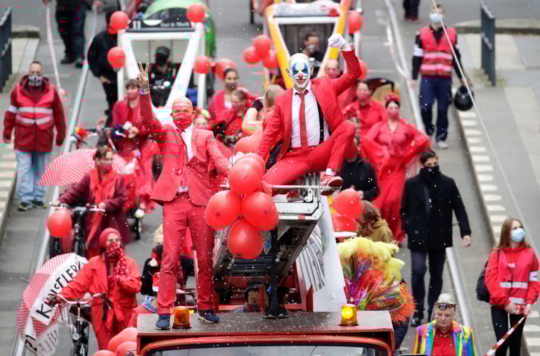 在柏林街頭,從事娛樂活動產業的民眾換上鮮紅色的裝扮,一邊抗議政府的防疫措施,一邊呼籲大眾支持受疫情重創的娛樂活動產業。