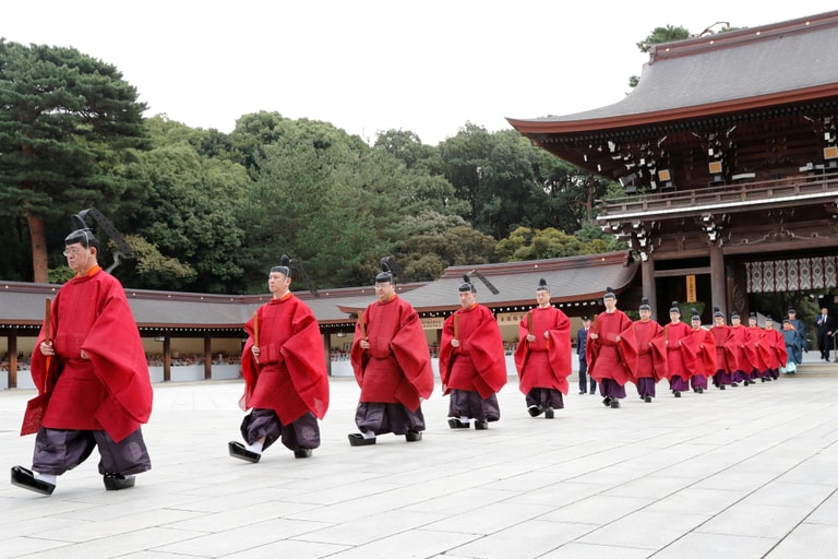在東京供奉明治天皇的明治神宮,神職人員正在進行紀念明治神宮啟用滿百年的慶祝儀式。