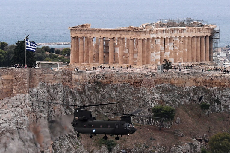 在雅典帕德嫩神廟前,一架希臘空軍的直升機緩緩飛過,紀念「不日」(Ohi Day)這一天。每年的 10月28日是希臘「向侵略者說不」的日子,藉此紀念第二次世界大戰期間,希臘軍隊擊敗義大利獨裁者墨索里尼(Benito Mussolini)軍隊的英勇事蹟。