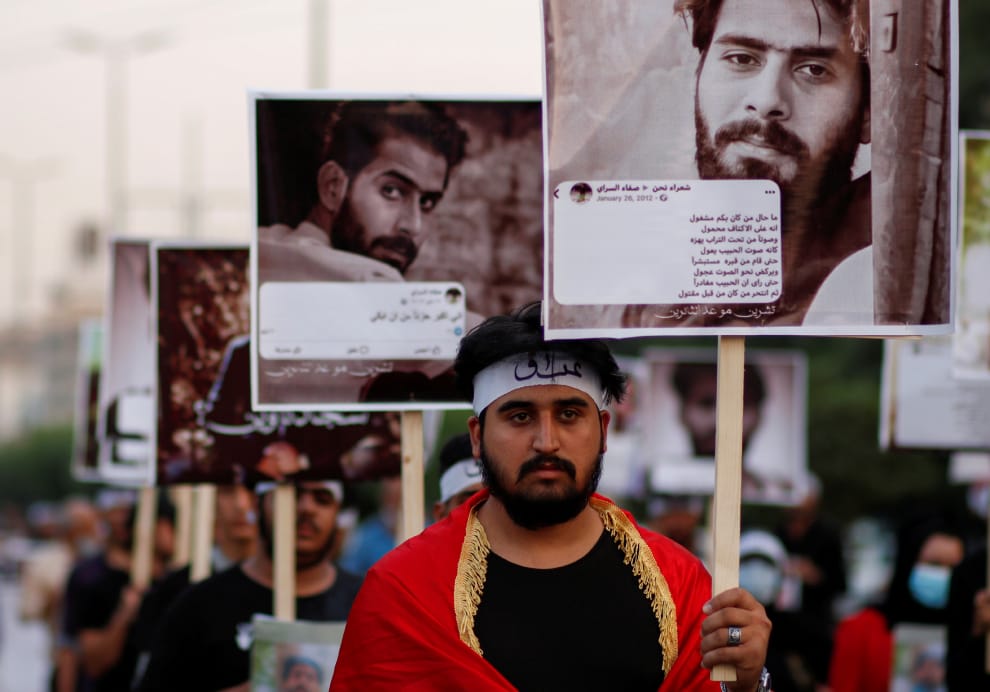 在巴格達街頭,民眾高舉在反政府示威活動中喪生的夥伴照片,抗議政府沒能聆聽人民的聲音。