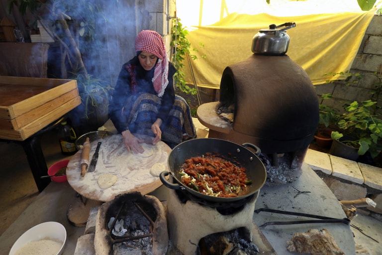在位於約旦西北部的阿傑隆鎮(Ajloun),一名女子正在用傳統烤爐烘焙麵包和糕餅。