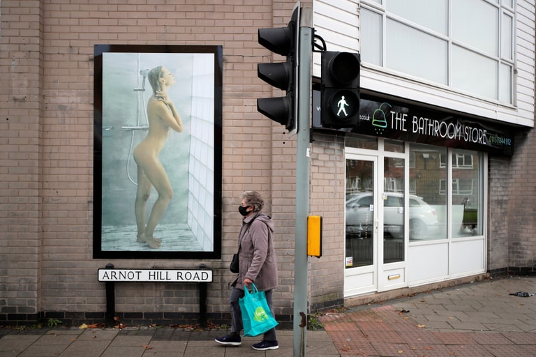 在諾丁罕郡的阿諾德鎮(Arnold),一名女子走過專賣衛浴設備的商店,一旁的牆上則貼有一張裸女淋浴海報。目前,這張海報已經被地方委員會視為「不恰當」而被要求撤下。