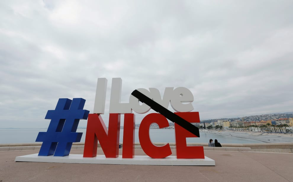 在法國南部城市尼斯,「#我愛尼斯」的戶外藝術裝置被人貼上了黑色膠帶,藉此悼念在聖母大教堂恐攻案中罹難的受害者。