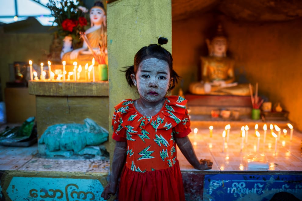 在仰光的一座佛塔內,一名小女孩畫上檀那卡(Thanaka),在點滿蠟燭的佛像前迎接照明節(Thadingyut)的到來。