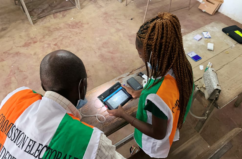 在象牙海岸經濟首都阿必尚(Abidjan)的郊區,選務人員正在操作用來辨識選民身分的平板電腦。