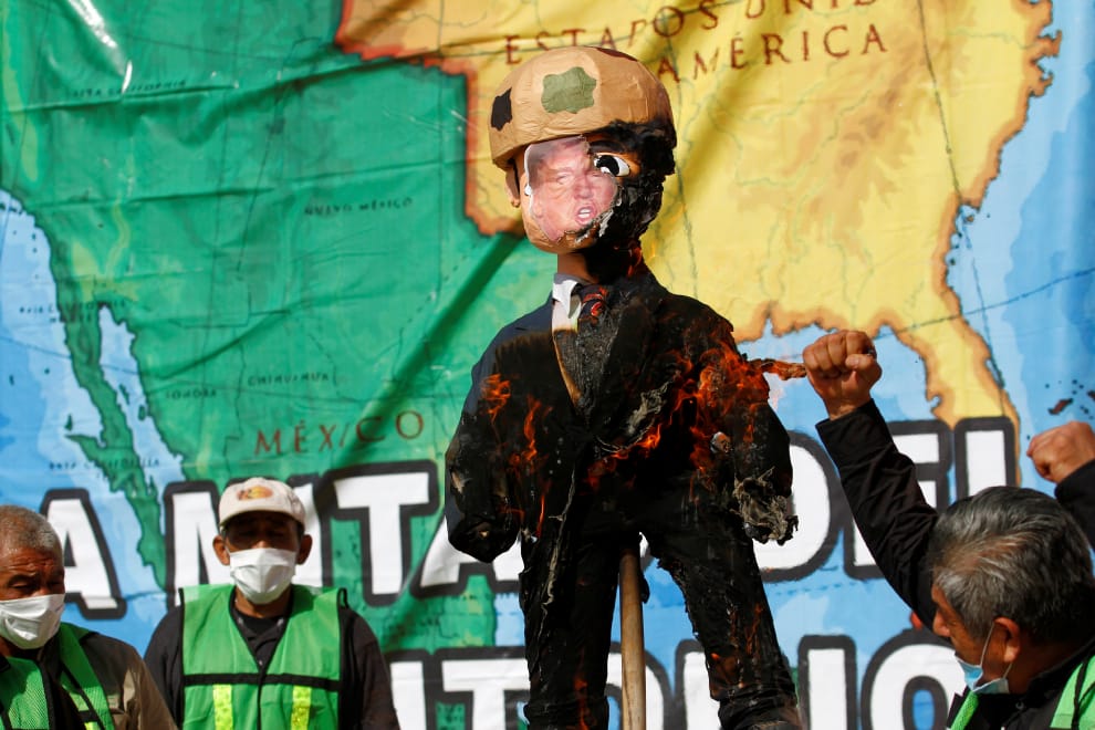 在美墨邊界的墨西哥提華納城(Tijuana),移民和公民組織的成員一塊焚燒美國總統川普(Donald Trump)模樣的「皮納塔」(pinata,註),藉此抗議川普政府的移民政策和擋在邊界的城牆。