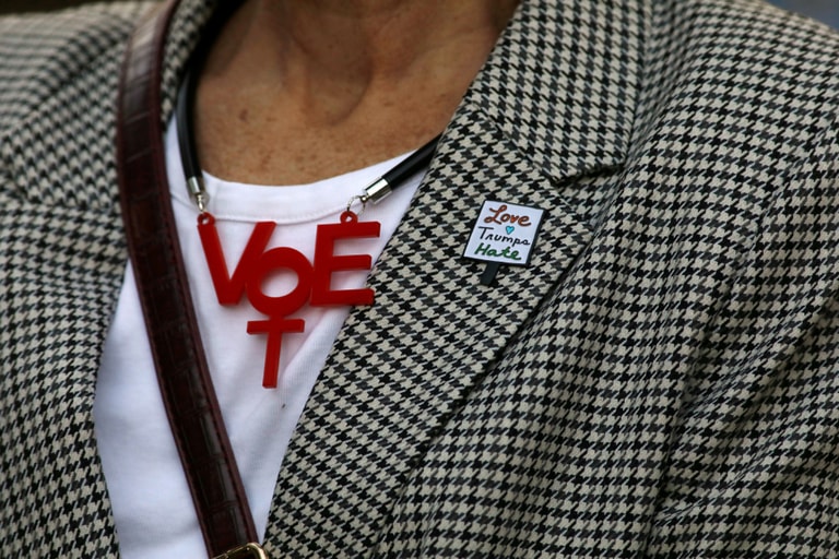 在北卡羅來納州的戈爾茲伯勒市(Goldsboro),一名民主黨支持者戴上呼籲大家出門投票的項鍊。