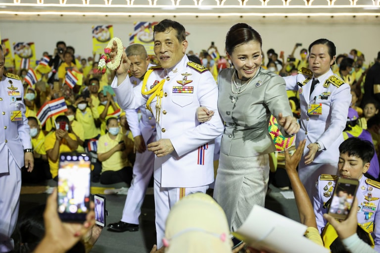 在曼谷大皇宮,泰國國王瓦吉拉隆功(Maha Vajiralongkorn)和王后蘇堤達(Suthida Tidjai)正在向支持者打招呼。