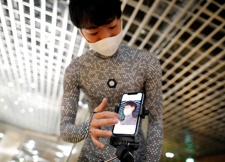 在東京網路服飾公司Zozo Inc.的辦公室內,工作人員正在展示第二代的Zozosuit,這是一套穿上後可以立刻測量身體尺寸的 3D量身服,能夠協助顧客認識自己的身形與尺寸。
