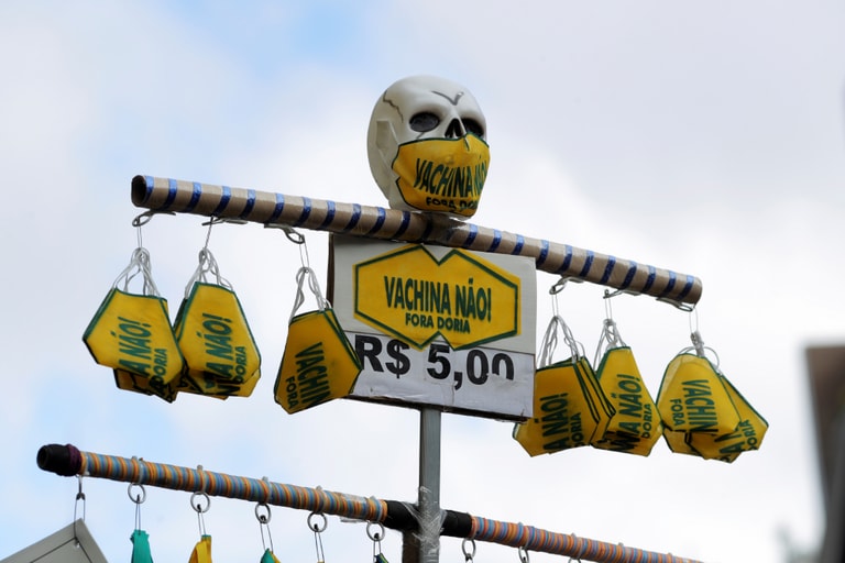 在巴西第一大城聖保羅的街頭,超過 300人上街反對聖保羅州州長多利亞(Joao Doria)的疫苗政策。其中,一名抗議民眾高舉寫有「不打疫苗」字樣口罩的骷髏頭告示牌。聖保羅州州長多利亞表示,他打算未來強制全州州民施打COVID-19(武漢肺炎)疫苗,現在則希望大家參與試打中國科興生技公司(Sinovac)開發的疫苗。