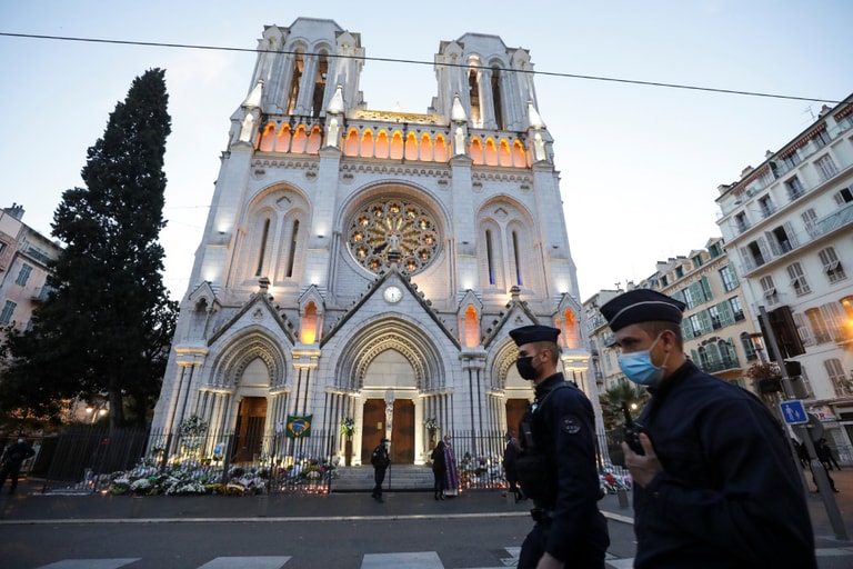 在即將舉行悼念彌撒的尼斯聖母大教堂,全副武裝的警察正在巡邏,以確保現場維安滴水不漏。
