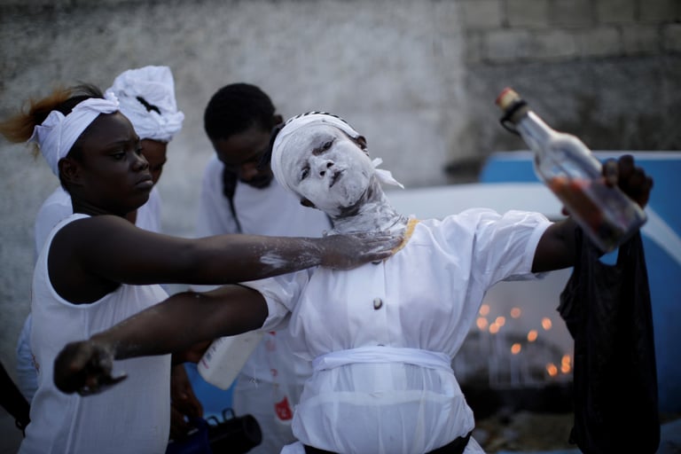 在首都王子港的一座墓園內,巫毒教的信徒將臉抹滿白色的滑石粉,準備迎接亡靈回家。