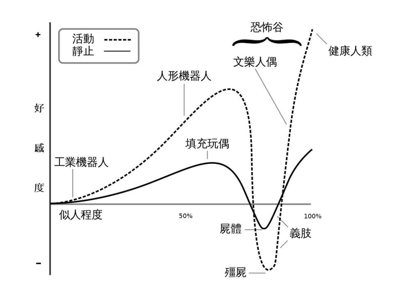 「恐怖谷理論」指的是隨著機器人在發展過程中與人類越來越相似,人們的好感度也會隨之上升;但是當相似度跨過一個門檻時,人們的好感度卻急遽下降的現象。不過,隨著機器人技術持續發展,擬真度繼續提高,人們的好感度又會止跌回升。