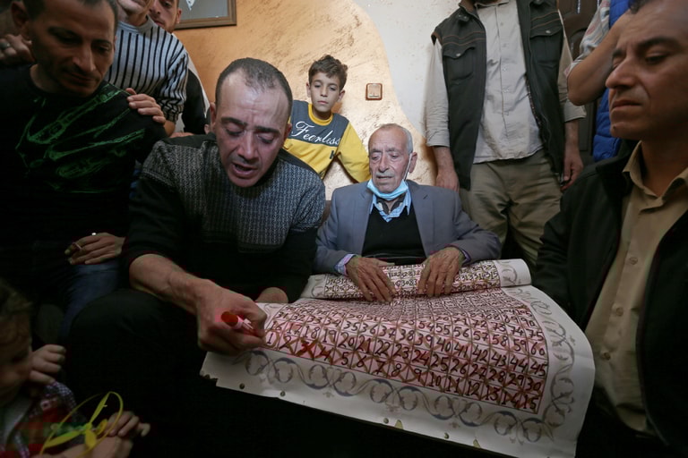 在加薩走廊南部的拉法市(Rafah),被關在以色列監獄十六年的格丹(Abdel-Raouf Qe'dan)總算回家,他的父親薩梅耶(Sameeh)讓格丹在出獄倒數計時的日曆上畫下最後一筆。