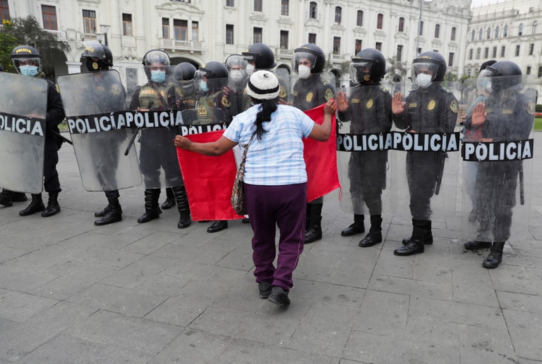 在祕魯首都利馬(Lima),一名女性跑到警察面前展開一面國旗,抗議秘魯國會彈劾廣受支持的祕魯前總統畢斯卡拉(Martín Vizcarra),將政權轉交給代理總統梅里諾(Manuel Merino)。