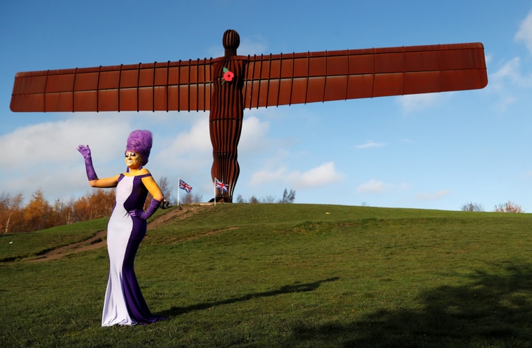 在英國東北部的蓋茨黑德鎮(Gateshead),擅長男扮女裝的藝術家達菲(Gladys Duffy)在停戰紀念日(Armistice Day)這天換上紫色禮服,到當地知名的藝術品北方天使(Angel of the North)前與天使合影。