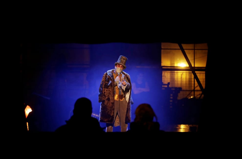 在捷克首都布拉格,觀眾們正在觀賞表演團體「Cirk La Putyka」帶來的一齣名為「文化外帶窗口」(Culture take-away window)的表演。