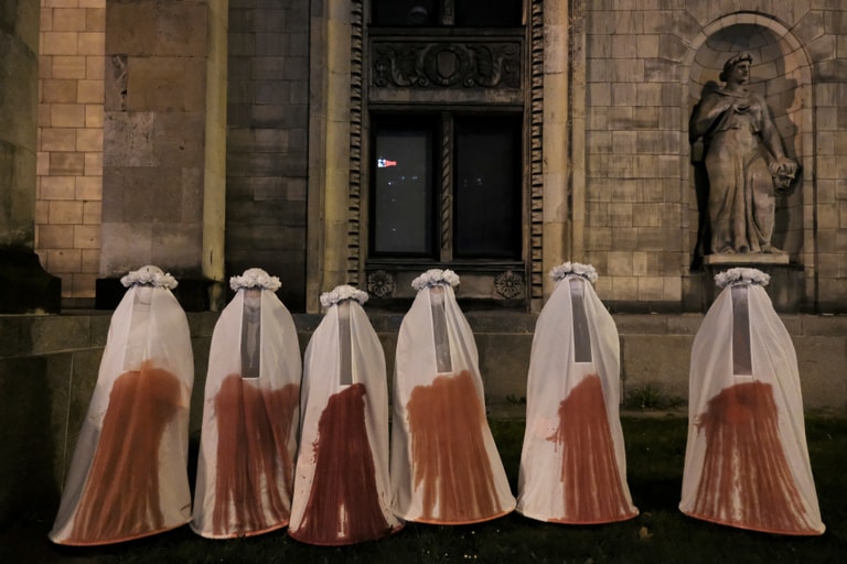在波蘭首都華沙的藝文中心科學文化宮(Palace of Culture and Science)附近,一群抗議者為了反對波蘭憲法法庭限縮婦女墮胎資格的決定,用一場小型演出向政府表達心聲。