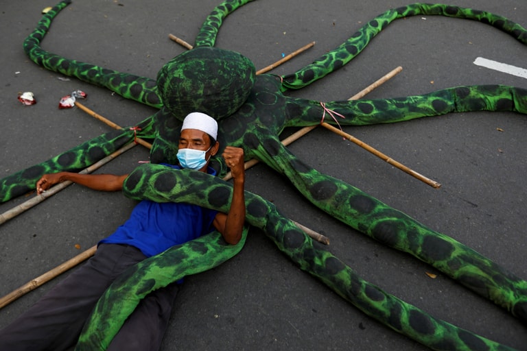 在印尼首都雅加達,一名漁夫戴上口罩,躺在反政府示威者創作的章魚藝術品上。