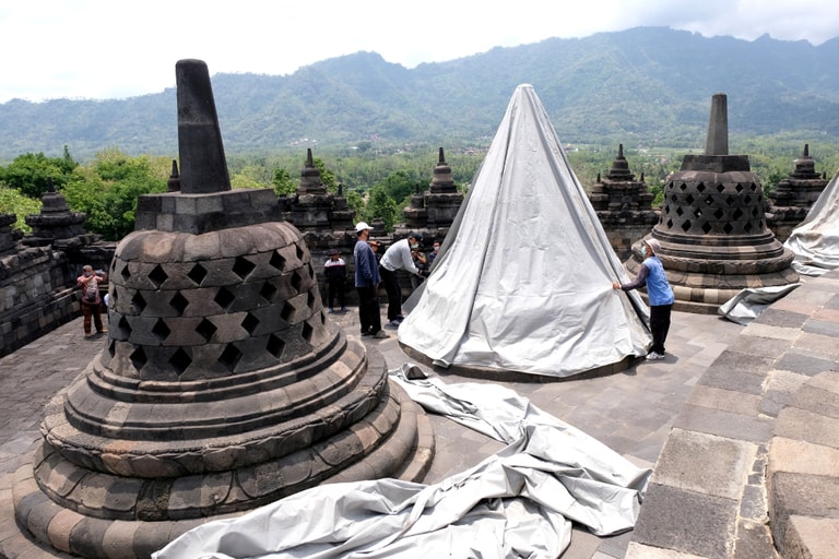 在印尼中爪哇省的知名古蹟婆羅浮屠(Borobudur temple),工作人員用布蓋住一尊石雕,避免它被火山灰給破壞。