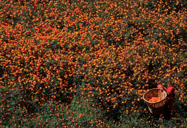 在尼泊爾首都加德滿都(Kathmandu),一名女性正在採摘萬壽菊,準備拿到市場上兜售,讓人們能用美麗的花朵製作成在排燈節(Tihar festival)上使用的花環。