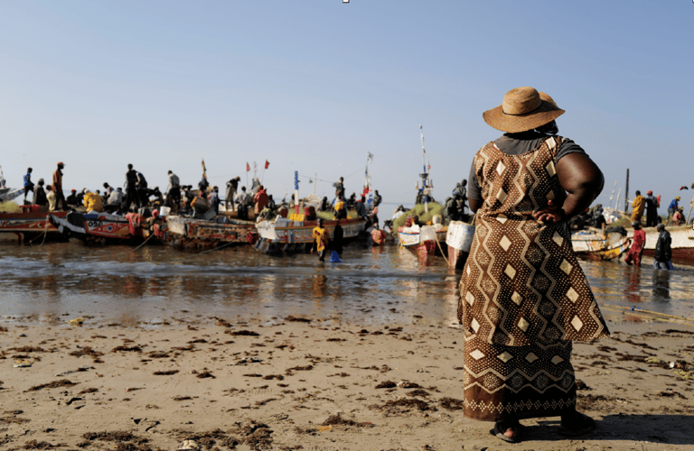 在塞內加爾西南部的漁港法迪奧(Joal Fadiouth),一名魚販在岸上等待著向滿載而歸的漁夫們購買漁獲。