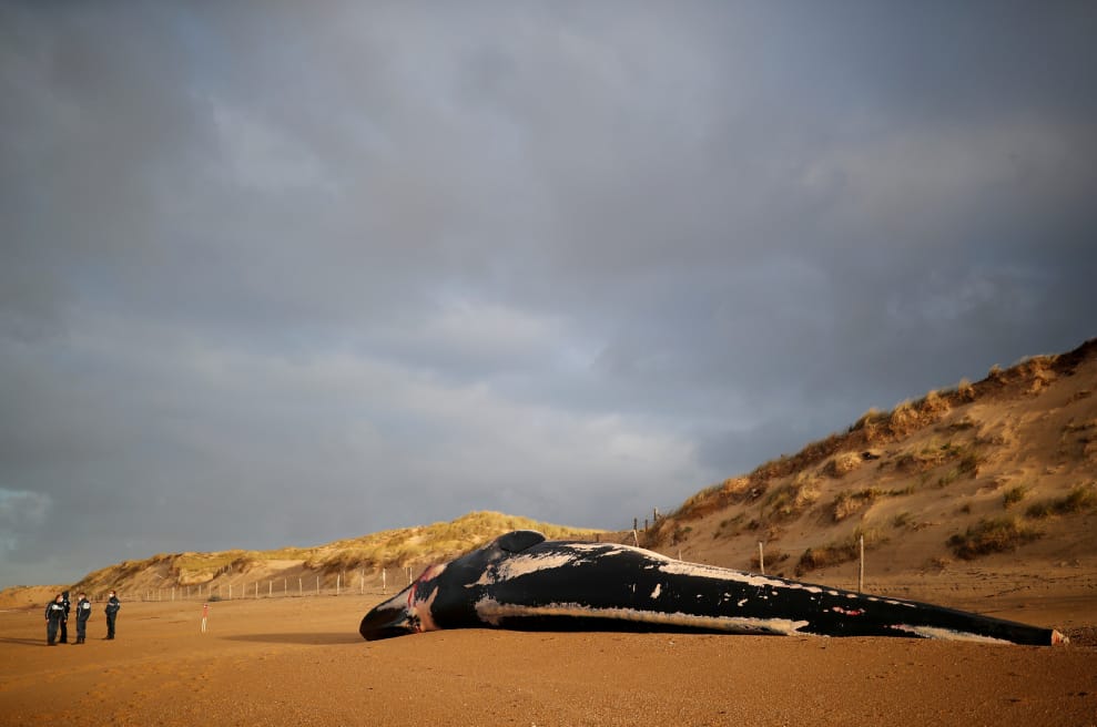 在法國西部羅亞爾河大區的聖伊萊勒德里耶鎮(Saint-Hilaire-de-Riez),人們在海灘上發現一隻擱淺長鬚鯨(Balaenoptera physalus)的屍體。