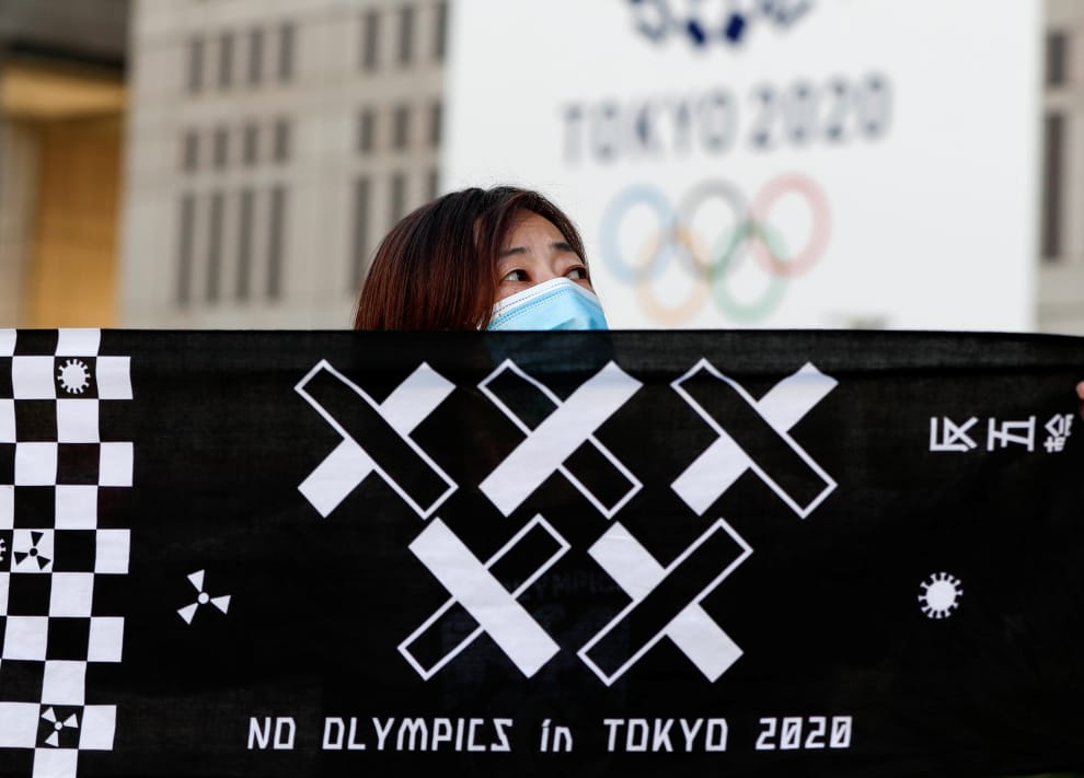 在日本首都東京的東京市政府辦公大樓(Tokyo Metropolitan Government Office Building)前,國際奧林匹克委員會(International Olympic Committee)的主席巴赫(Thomas Bach)特地前來拜訪東京市長小池百合子(Yuriko Koike)。同一時間,一名反對日本舉辦 2020東京奧運的民眾也帶著標語到場抗議。