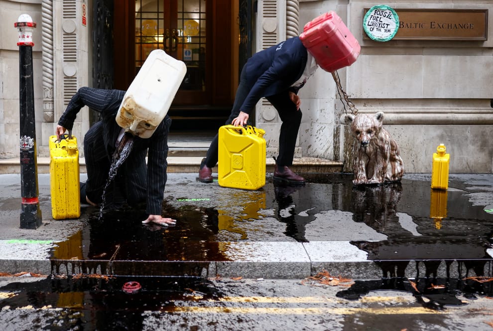 在英國倫敦波羅的海交易所大樓(The Baltic Exchange building)外,環保團體海洋反叛(Ocean Rebellion)正在進行一場表演,向國際海運會議所(International Chamber of Shipping)抗議全球航運對氣候變遷造成的嚴重影響。