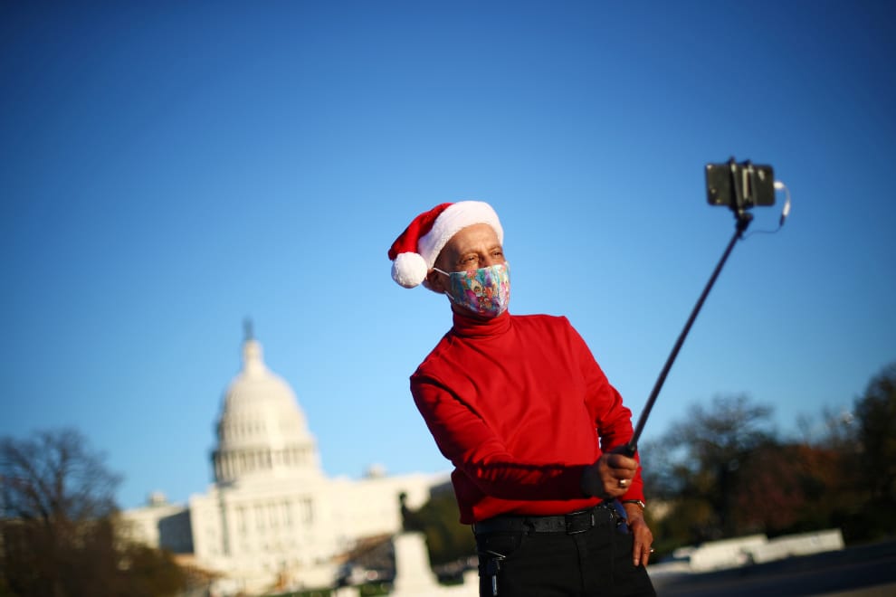在華盛頓特區的國會山莊(U.S. Capitol building)前,一名男子戴著聖誕帽準備自拍。