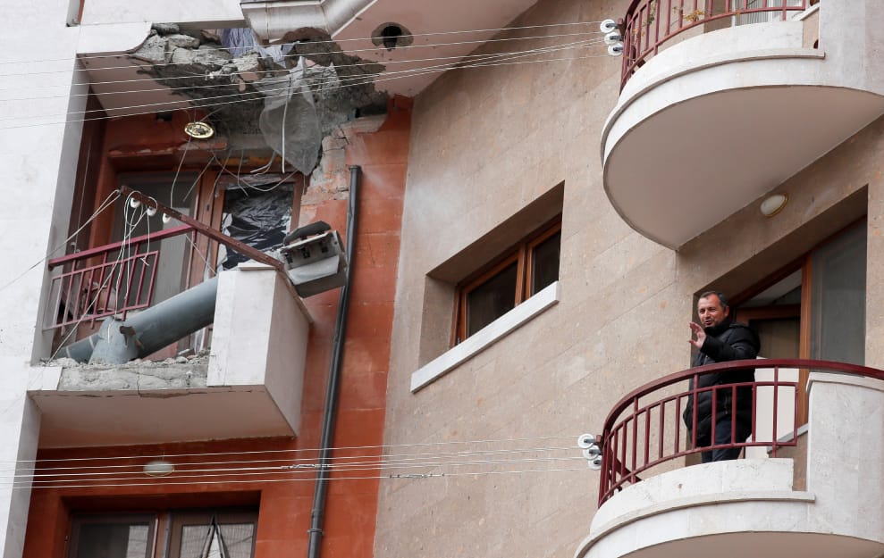 在亞塞拜然、亞美尼亞間爭議領土納戈爾諾-卡拉巴赫(Nagorno-Karabakh)地區的斯捷潘奈克特(Stepanakert),一名男子正站在自家的陽台上。在過去 6周的戰爭裡,他的家也曾被飛彈轟炸過,一旁的陽台上還留著當時飛彈爆炸的痕跡。