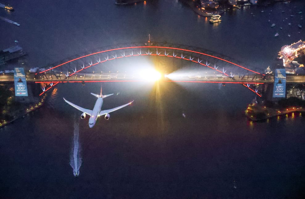 在澳洲,一架隸屬於澳洲航空(Qantas),編號QF100的班機飛過雪梨港(Sydney Harbour)上空,慶祝澳洲航空成立滿 100年。