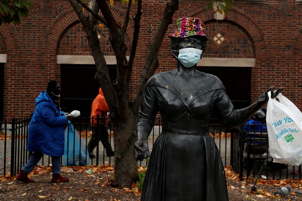在美國紐約州的揚克斯市(Yonkers),有人替已故歌手艾拉·費茲潔拉(Ella Fitzgerald)的銅像戴上帽子和口罩。