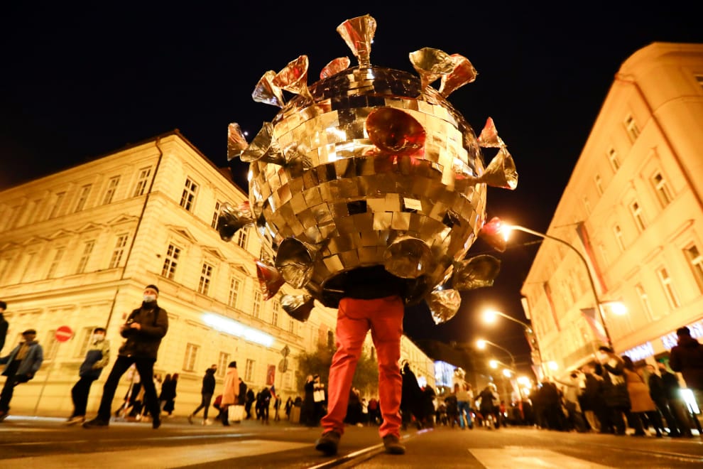 在捷克首都布拉格,16號這天本該是捷克慶祝 1989年天鵝絨革命(Velvet Revolution)31周年的日子,但政府的一系列防疫措施卻使得民眾無法上街遊行。因此當天仍有一部分群眾打破規定,走上街頭抗議政府的防疫措施,圖中這名男子也打扮成COVID-19(武漢肺炎)病毒的樣子,加入抗議群眾的行列。
