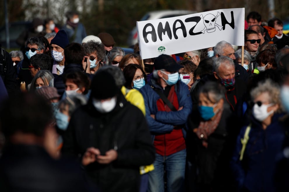 在法國西部南特區的蒙特貝爾鎮(Montbert),示威者們戴上口罩,參加一場示威,拒絕讓電商巨頭亞馬遜(Amazon)在此設立全新的物流中心。