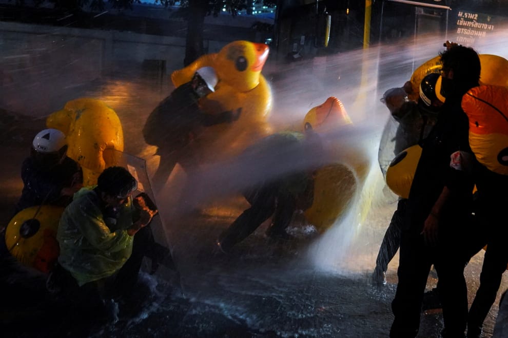 在泰國首都曼谷的國會大廈附近,反政府示威者用黃色小鴨充氣船權充盾牌,抵擋自警方水砲車中射出的強力水柱。
