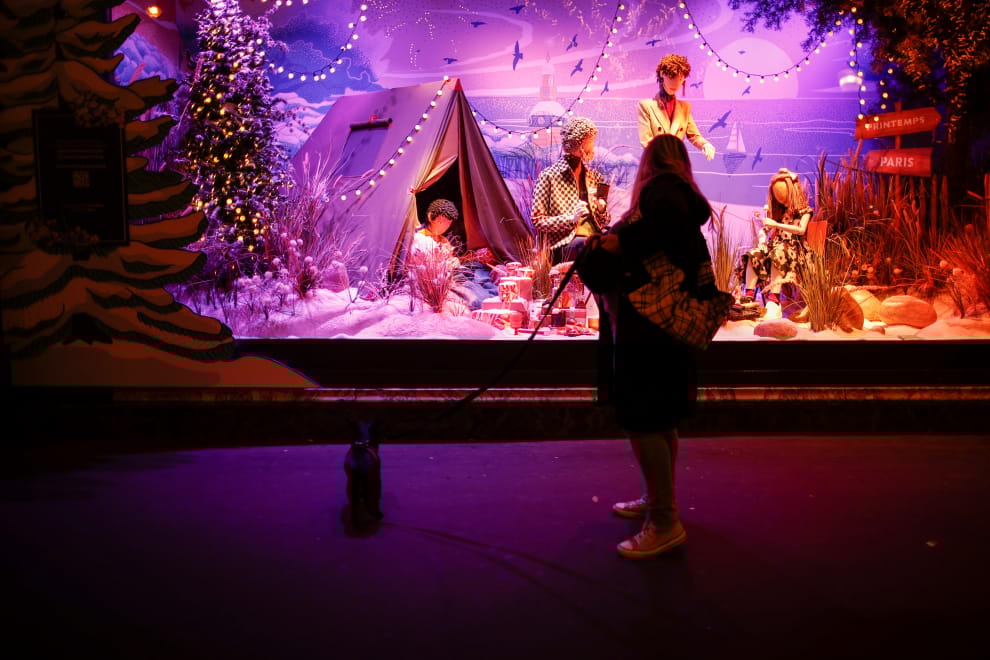 在法國首都巴黎的巴黎春天百貨(Printemps department)櫥窗外,一名路人和她的狗停下腳步,望著櫥窗裡的聖誕裝飾。
