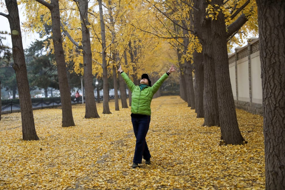 在中國首都北京,一名女性站在兩排銀杏樹(Ginkgo biloba)下,敞開雙臂歡迎秋天的到來。
