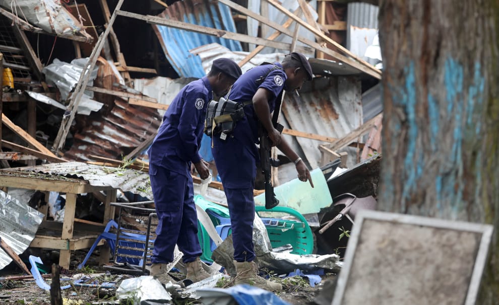 在索馬利亞首都摩加迪休(Mogadishu),警察學院附近的一間餐廳發生一起自殺炸彈攻擊,造成至少 5人死亡、10人受傷,索馬利亞恐怖組織青年黨(Al-Shabaab)已經出面坦承犯案。兩名警察在案發後趕到現場,細細檢視爆炸現場。